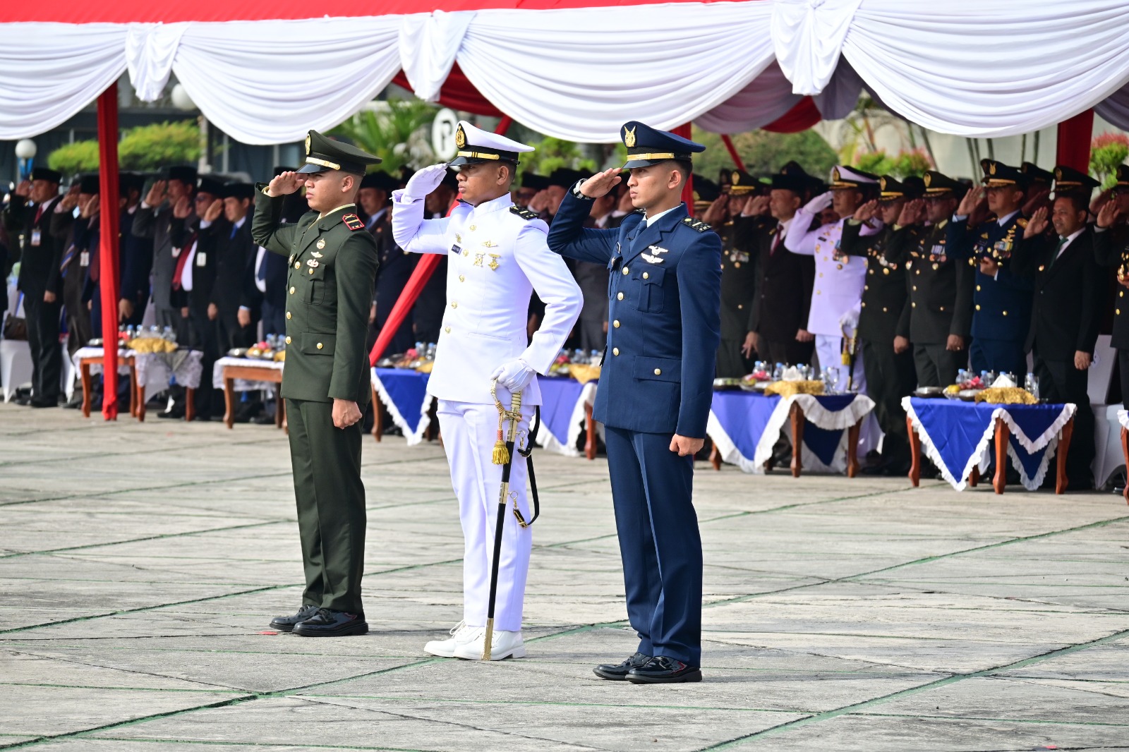 Tiga matra TNI tampil gagah dan berwibawa, sementara petugas upacara dari kalangan pelajar menambah kesakralan momen peringatan ini.